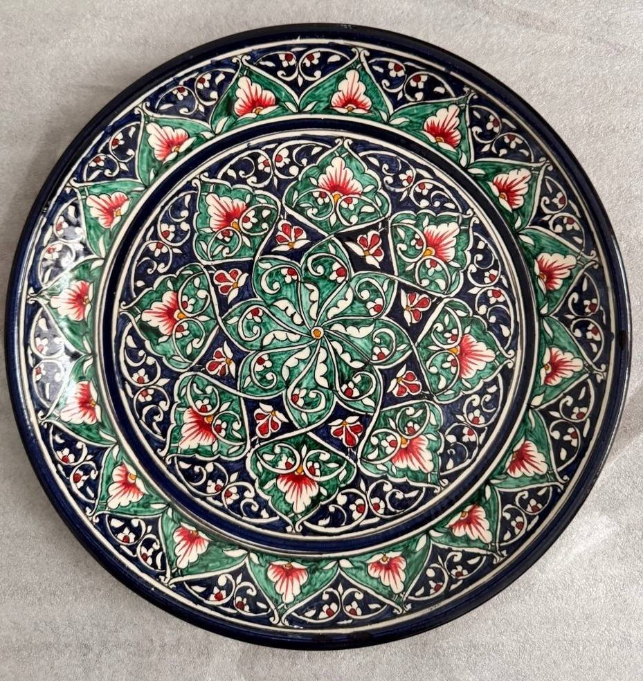The Qora Qalam ceramic plate is a refined handcrafted artwork made by skilled Uzbek artisans. Featuring intricate hand-drawn floral and geometric patterns in deep blue, green, and red tones, this piece reflects traditional Qora Qalam artistry and exceptional attention to detail. Each plate is individually hand-painted, making every piece truly unique.